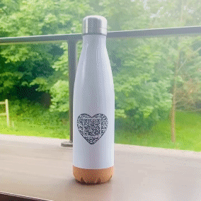 - Farbe: Weisse Flasche mit schwarzem, herzförmigem QR-Code – Affirmation wird auf einem weissen Hintergrund ausgespielt