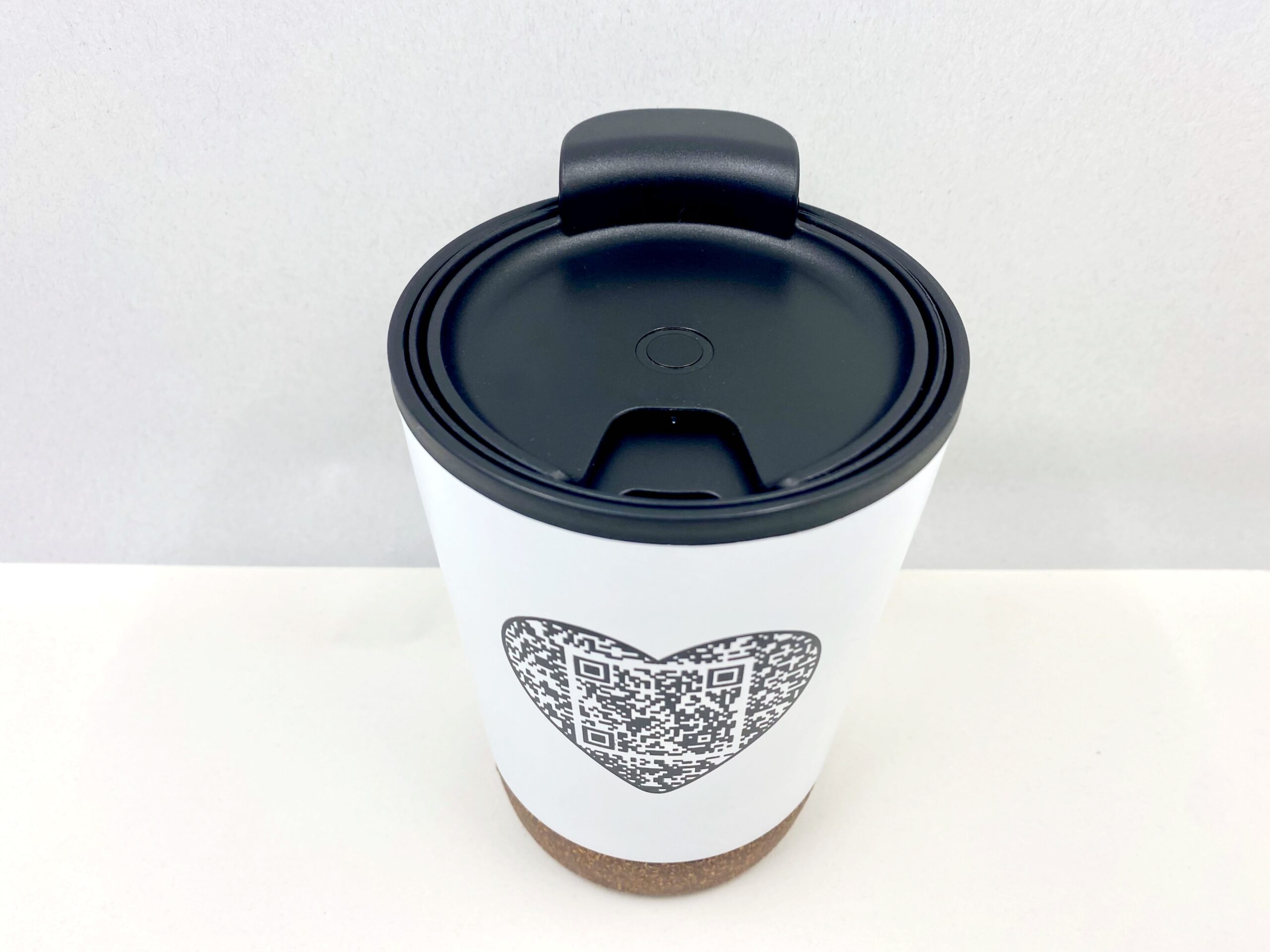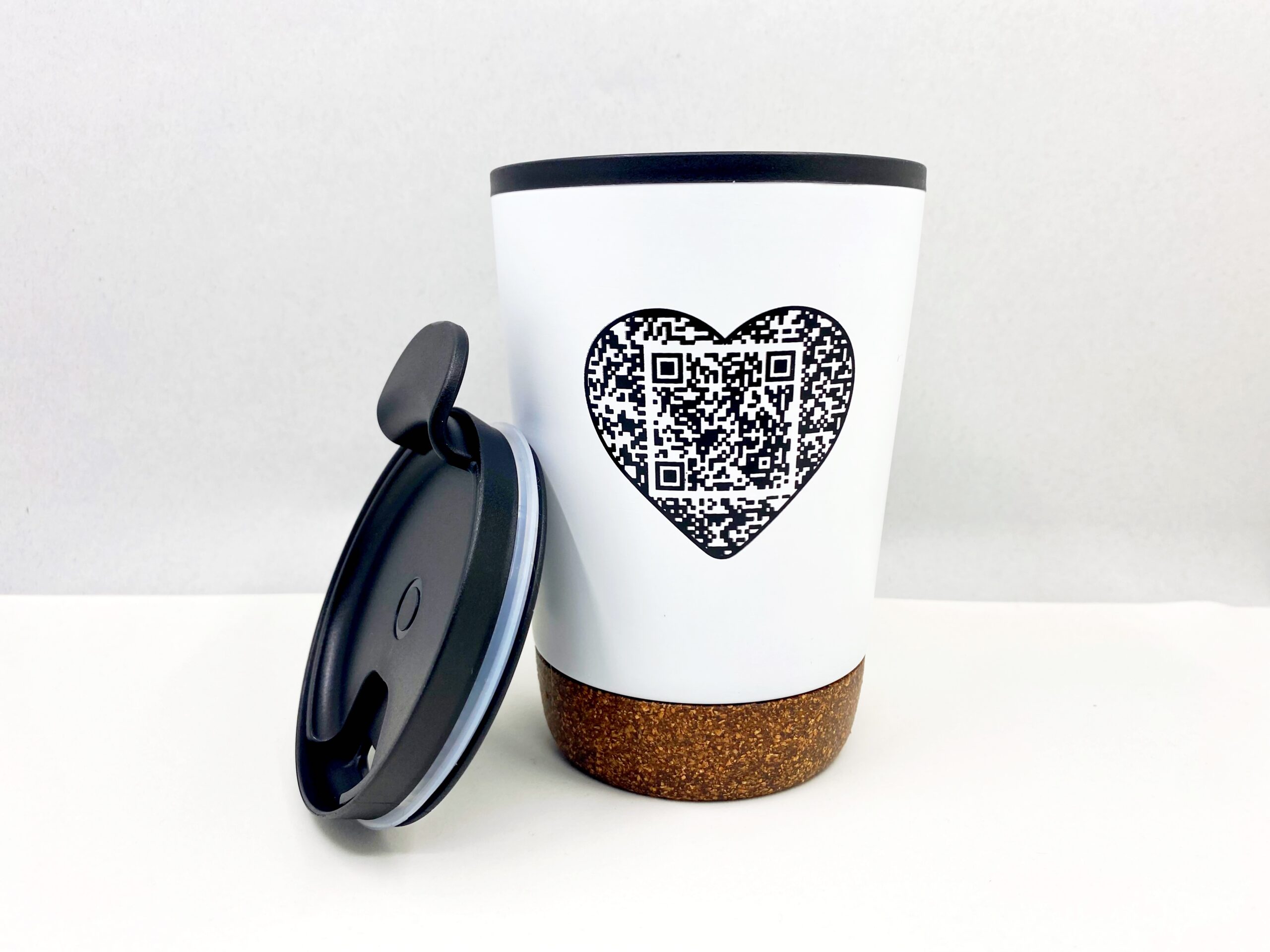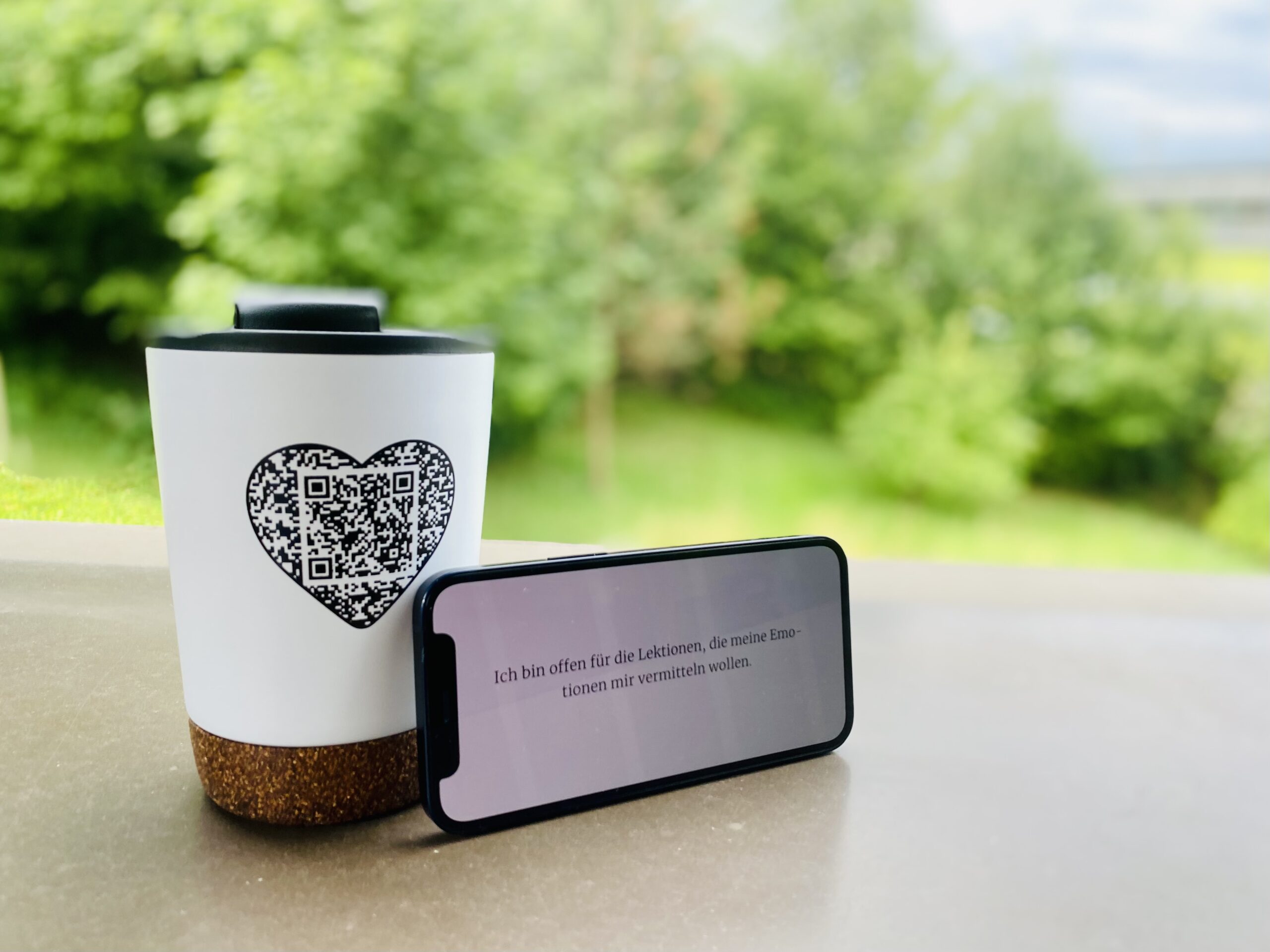 - Farbe: Weisser Becher mit schwarzem, herzförmigem QR-Code – Affirmation wird auf einem weissen Hintergrund ausgespielt